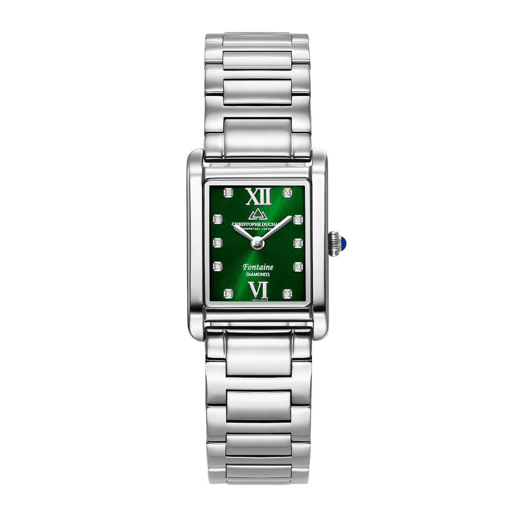 The feminine inspired Fontaine watch is a true statement of elegance. This timepiece, with is symmetrical case is crafted from stainless steel and sapphire crystal glass. Built with ten brilliantly round cut diamonds. Each scintillating stone majestically catching the light. Powered by Swiss movement, this classic timepiece is perfect for any formal occasion.