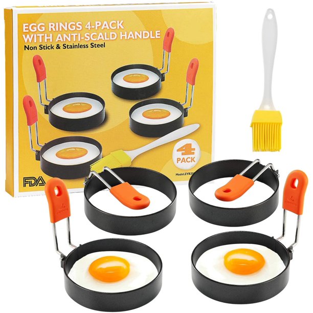 - Egg Rings: Great value egg rings with silicone oil brush, BPA free, refined non-stick coating and fold-up stainless steel handle.