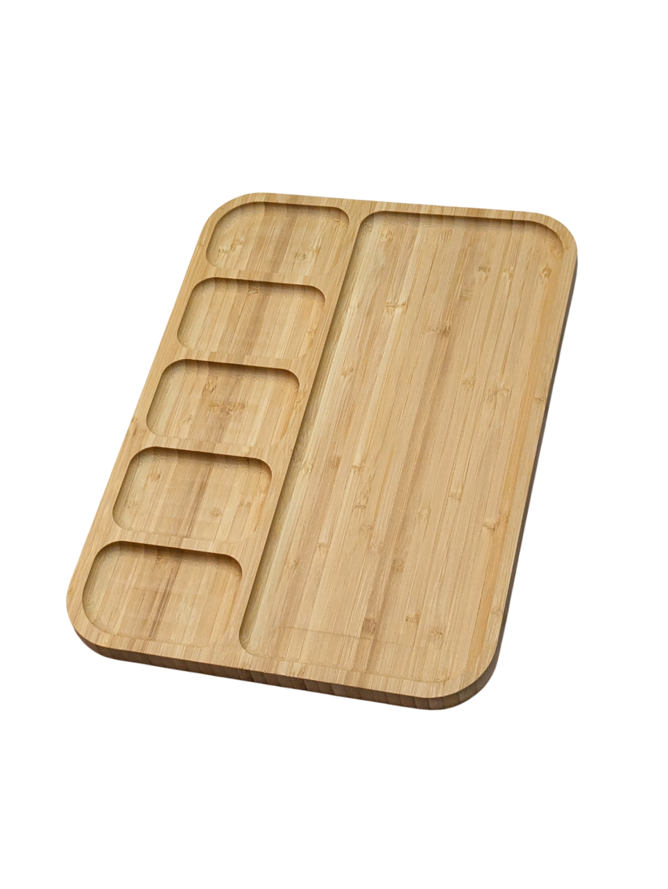 Add a touch of elegance to your gatherings with this beautifully crafted bamboo snack server. Designed with six spacious compartments, it’s perfect for presenting your favorite treats in style—be it gourmet cheese and crackers, fresh cucumbers and feta, or a delightful mix of olives and nuts and much more!