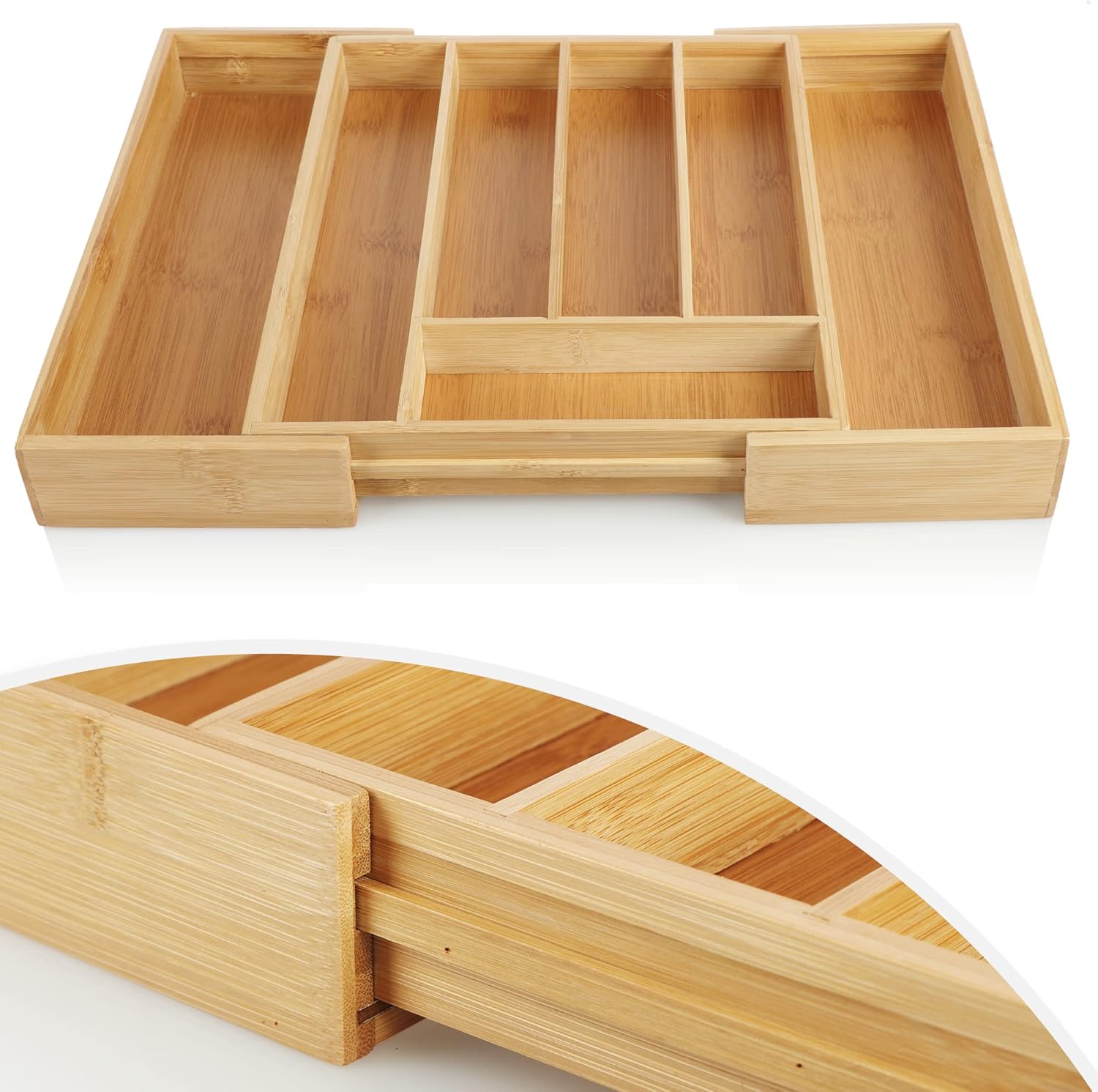 Declutter your home with this versatile and eco-friendly extendable bamboo cutlery tray. Made from sustainable bamboo, this durable and easy-to-clean organizer expands to perfectly fit your drawers. Its adjustable design offers 5 to 7 compartments, providing ample storage for everything from silverware and kitchen utensils to office supplies and bathroom accessories. Enjoy a tidy and efficient space with this stylish bamboo solution.