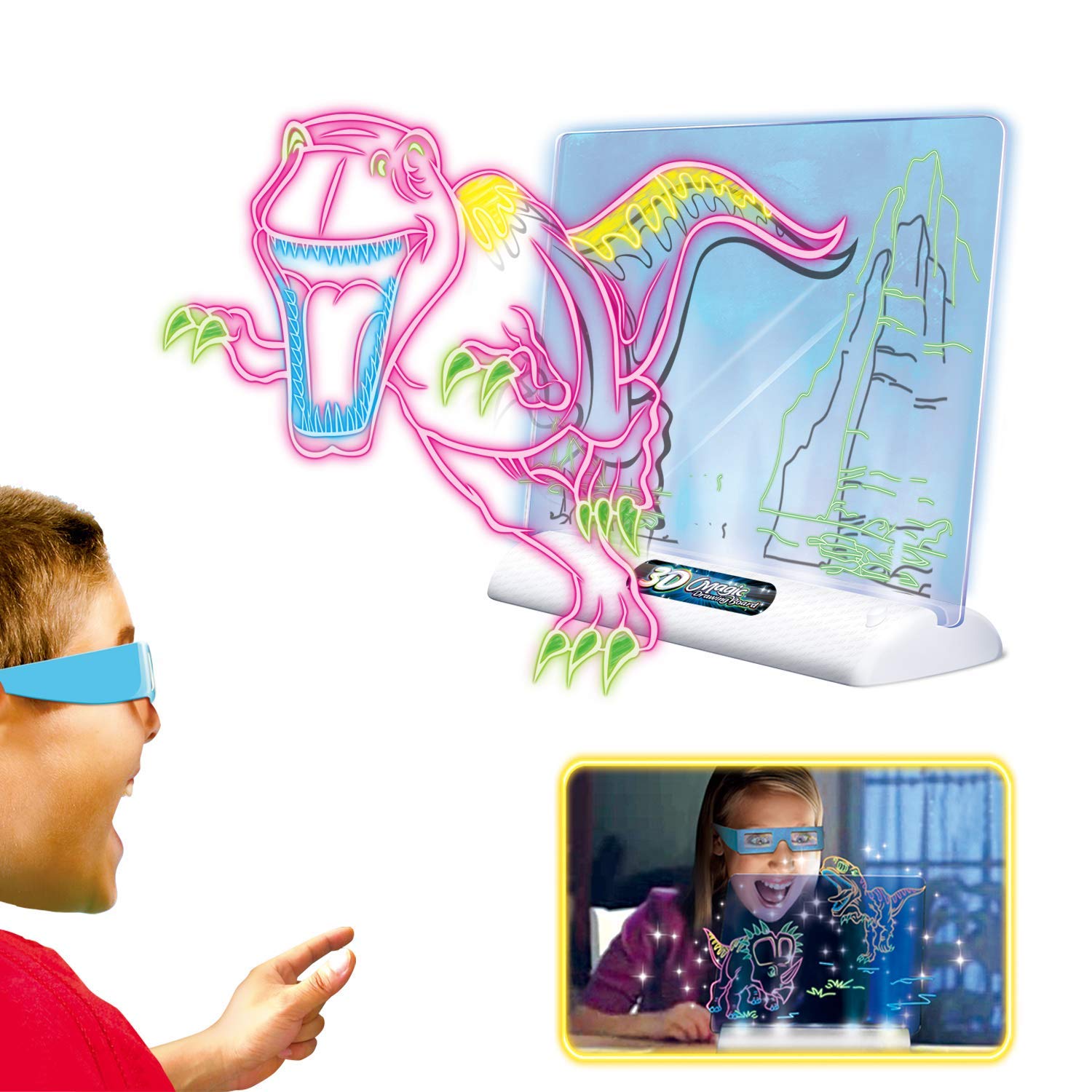 Use your imagination to draw your ideas onto this Magic 3D Drawing Board. Place your drawing on the transparent board and into the LED lamp holder and turn off the lights. Watch your creation come to life when you put the 3D glasses provided on!